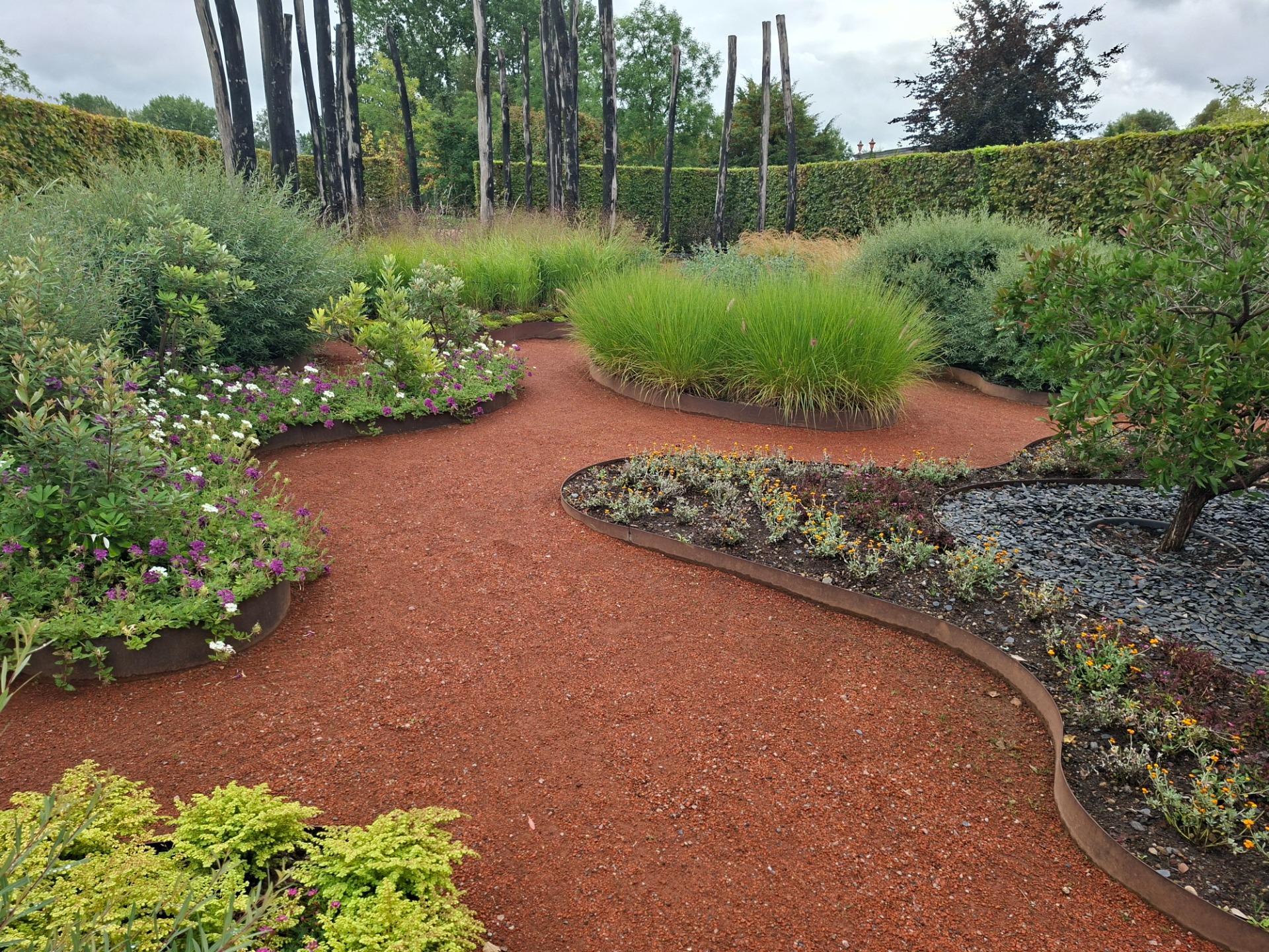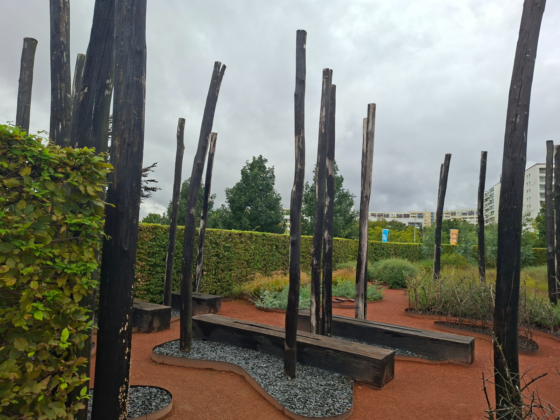 Zur Eröffnung der IGA Berlin 2017 präsentierte sich das australische Gartenkabinett frisch verbrannt: verkohlte Pfähle auf schwarzen Böden, auf denen sich verbrannte Büsche in den Himmel strecken. Dieser ungewohnte Anblick irritierte wohl einige Besucher*innen, die überrascht direkt am Eingang zu dem Garten wieder kehrt machten.