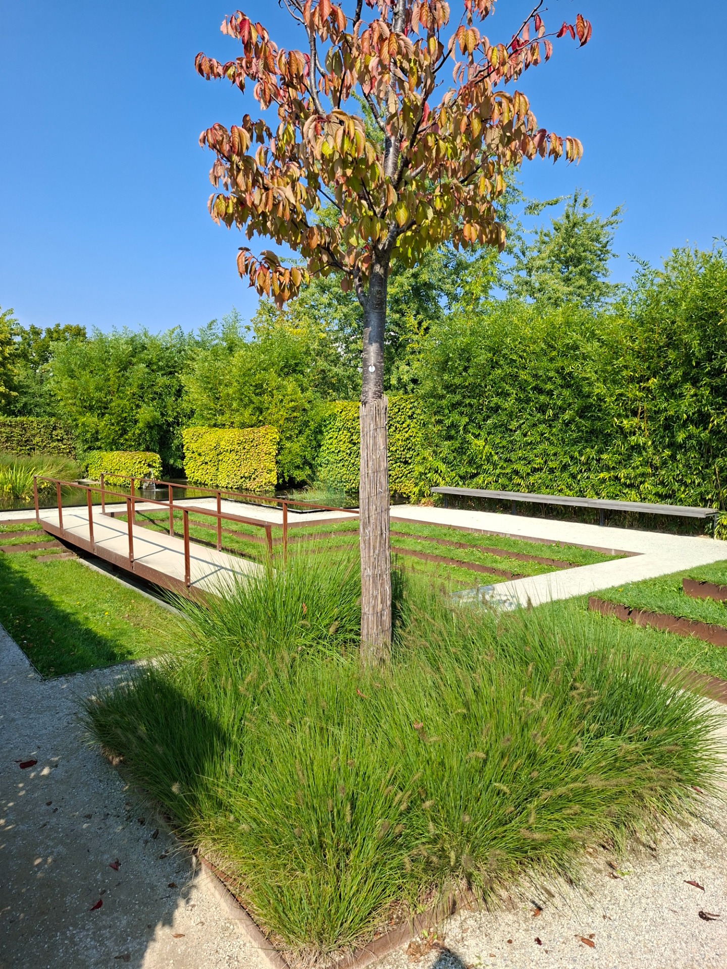 Das Wasserbecken erreichst man über eine Brücke: Sie führt über stufenförmig angelegte Rasenflächen, die in Cortenstahl eingefasst sind. Die Rasenflächen finden sich nochmals in invertierter Form als Podest, von dem aus der Besucher die eindrucksvolle Präzision des Gartens in seiner Gesamtheit betrachten kann.