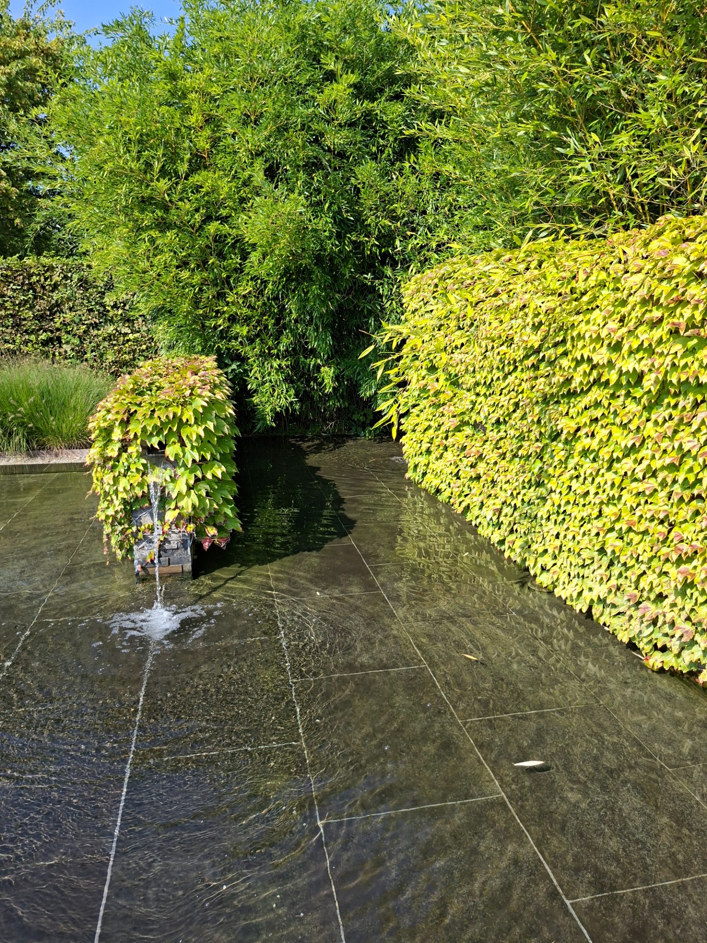 Beim Betreten das Gartens schaust du auf ein geometrisch gestaltetes Wasserbecken, auf dessen Oberfläche sich stimmungsvoll das Licht bricht. Aus einem bestimmten Betrachtungswinkel scheint es, "als würde das Becken in Flammen stehen". Rotbraune Pflanzungen am Ufer unterstreichen diesen Eindruck zusätzlich. Die vier aus dem Wasserbecken ragenden Steinwände schaffen durch ihren "rotbraunen" Stein und ihre Höhe zusätzliche visuelle Ebenen im Garten.