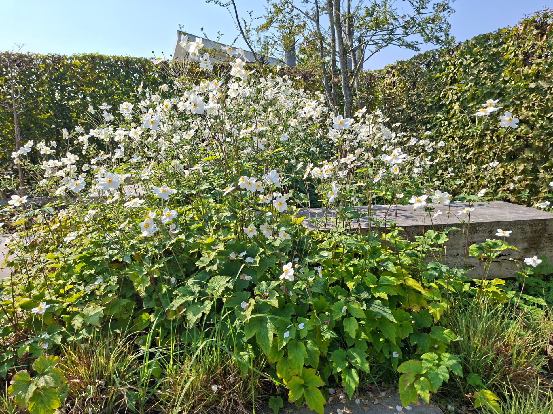 Die Scheinbuchen wurden 2017 entlang klarer Linien gepflanzt, wachsen seitdem aber ungehemmt über alles, was ihnen in die Quere kommt. Nochmals durchbrochen ist die wild anmutende Landschaft durch zufällig platzierte Bänke aus Rohmarmorfragmenten, die zum Verweilen und Entspannen einladen. "Genieße den Augenblick!"