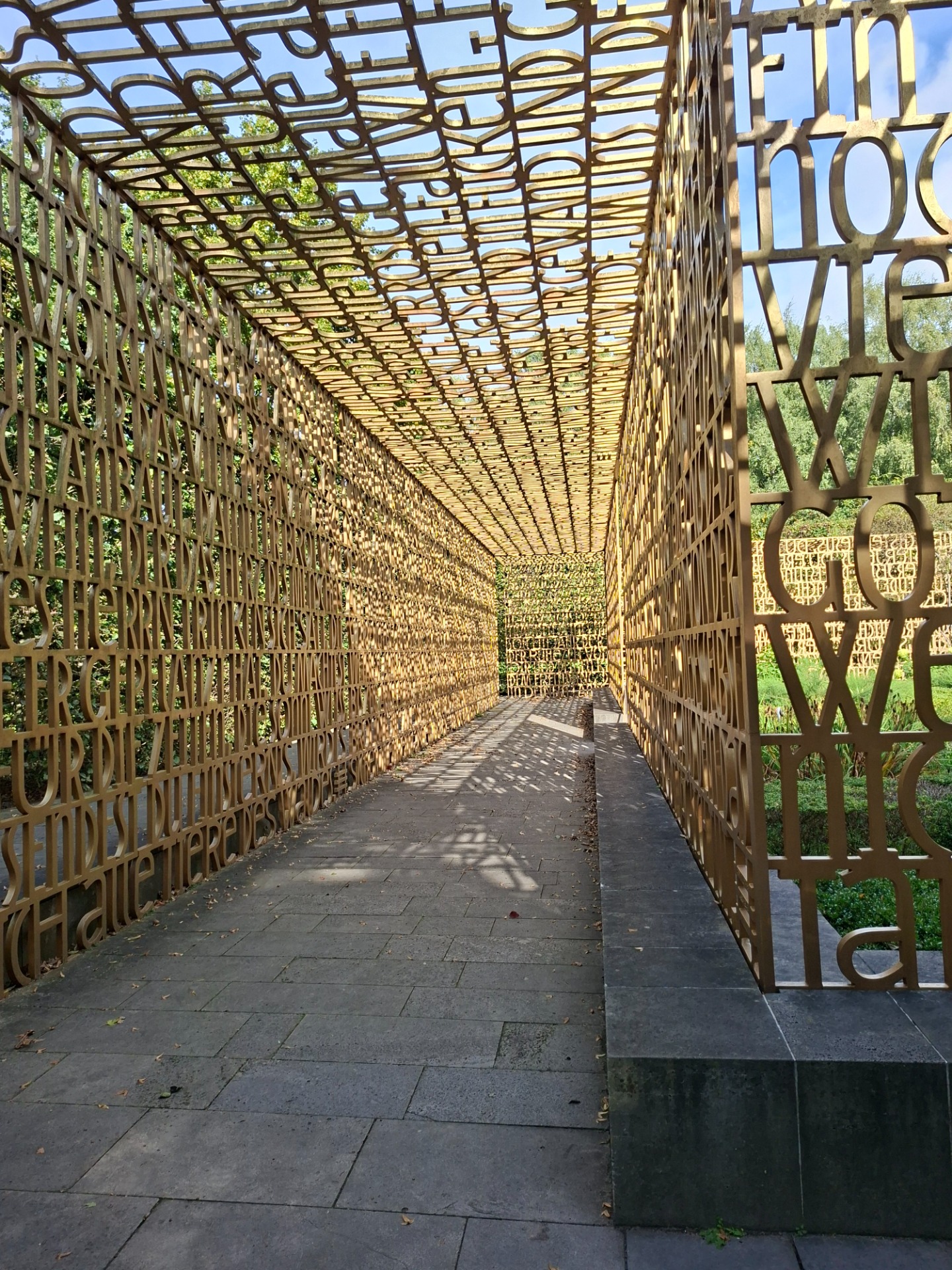 Die Texte sind auch der ungewöhnliche "Baustoff" der Installation: Die in gold-lackierten Metall-Lettern wurden eigens für den Bau gestaltet und gefertigt.