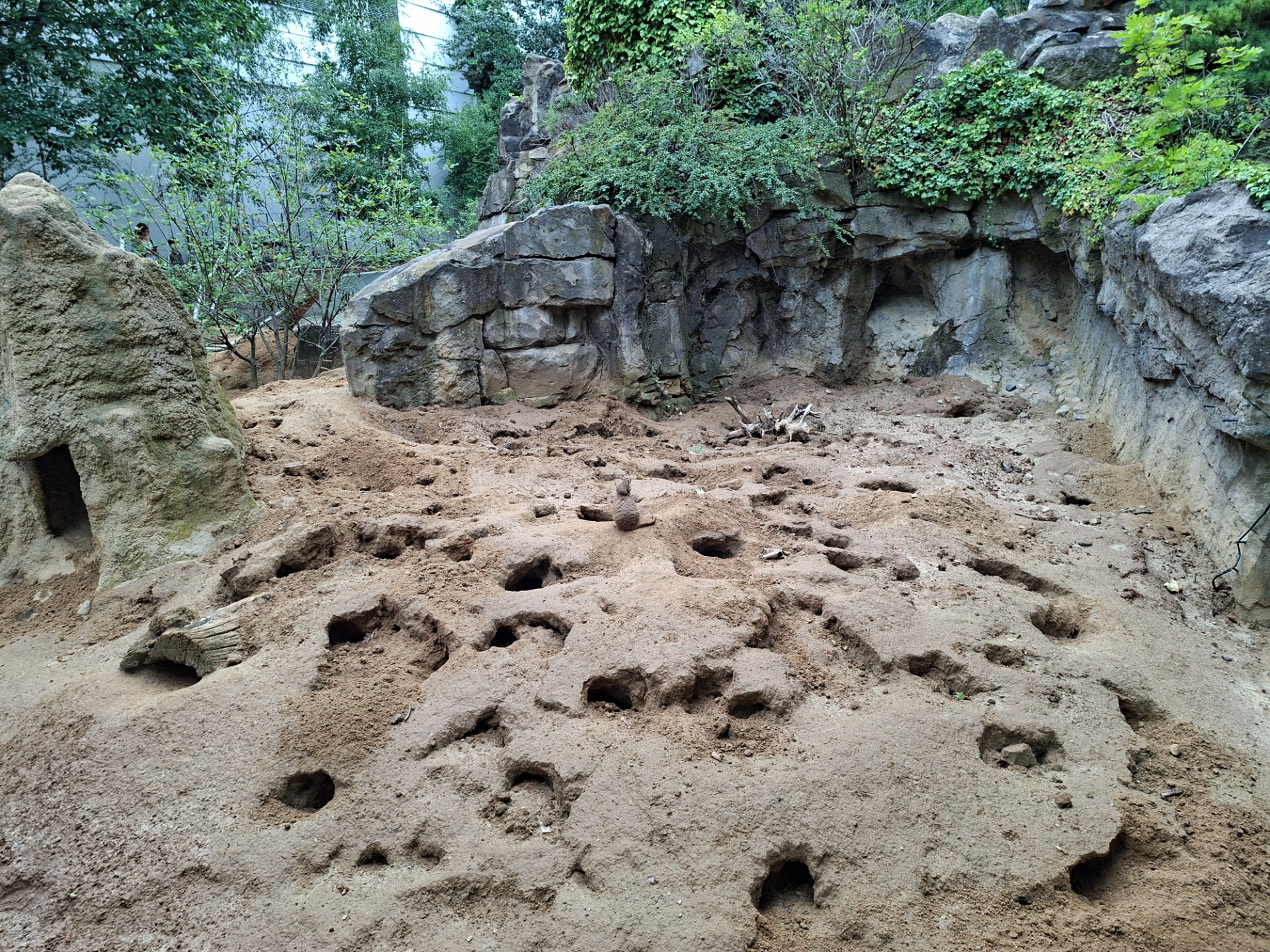 Im Zuge der Arbeitsteilung hocken mehrere Mitglieder der Gruppe vor den Eingängen, nur auf den Hinterbeinen sitzend, und halten Ausschau nach Feinden.
