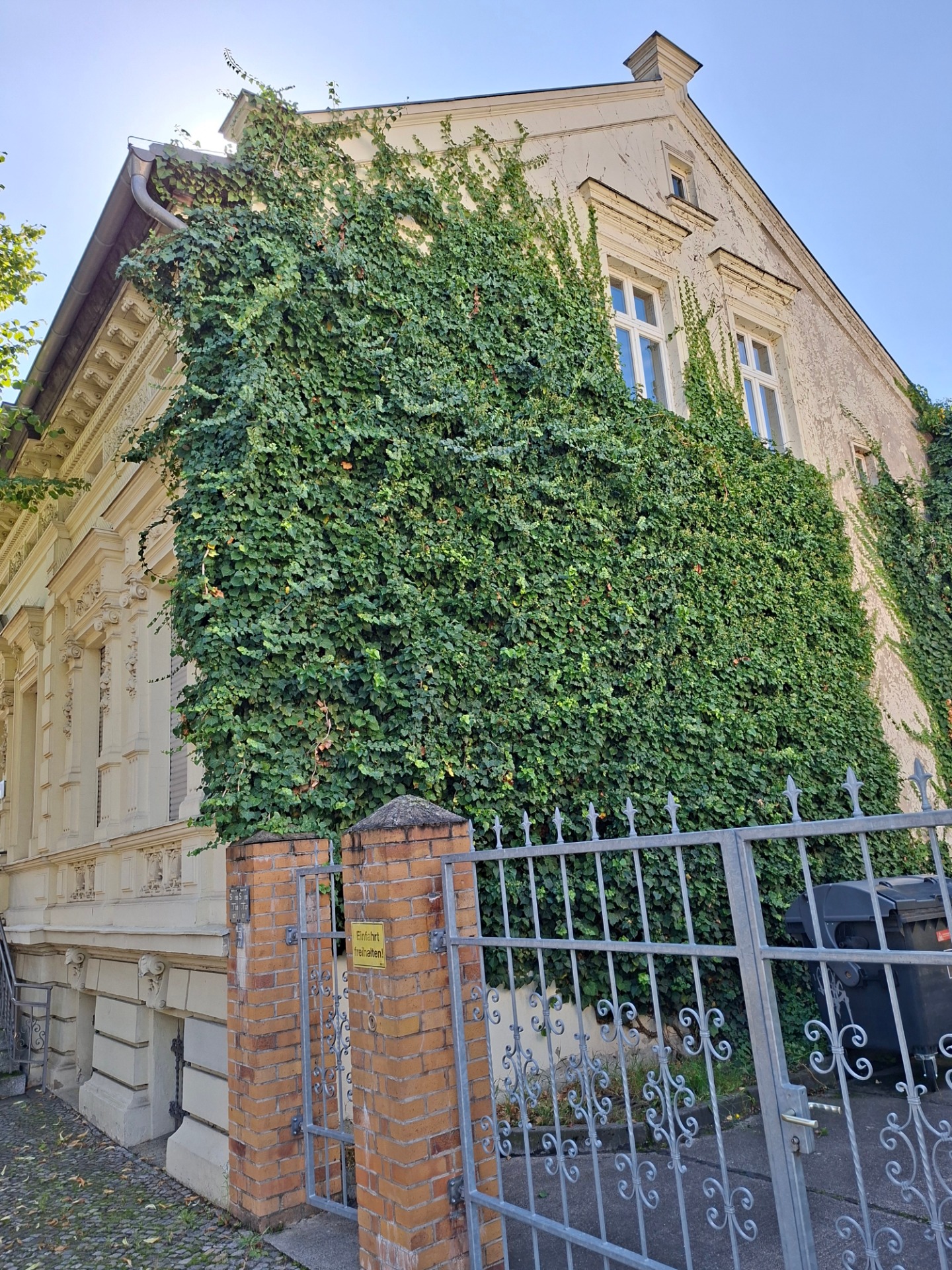 Unmittelbar im früheren Dorfkern ist die Straße noch mit Kopfsteinpflaster versehen; es gibt breite Fußwege und einen schmalen Grünstreifen dazwischen.