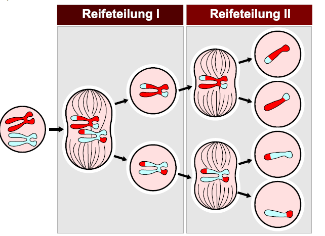 (Bild oben: Meiose: Ergebnis = 4x haploide Tochterzellen bzw. Geschlechtszellen = Keimzellen = Gameten)
