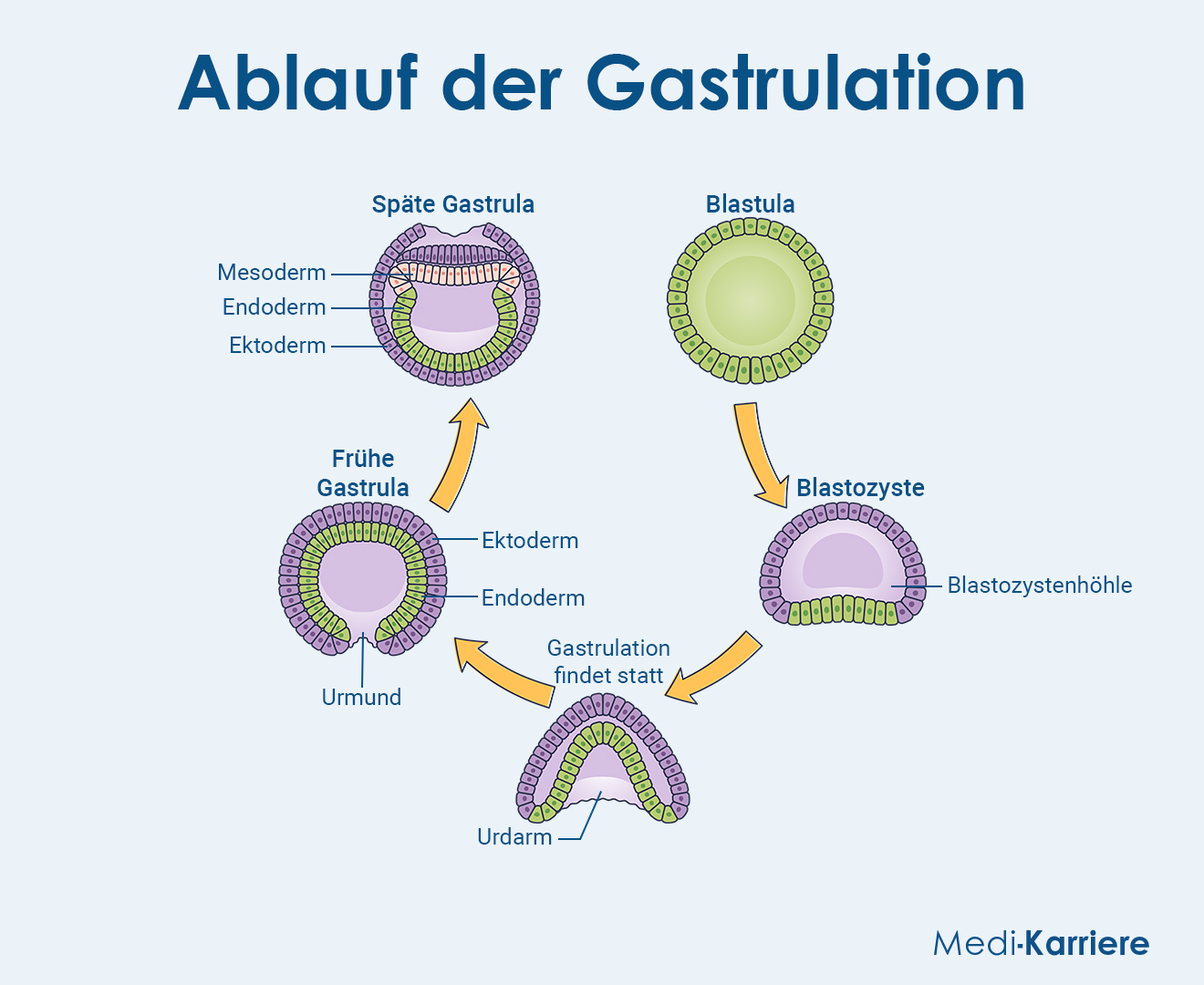 - *Gastrulation: formt die drei Keimblätter, aus denen sich alle Organanlagen und Gewebe entwickeln