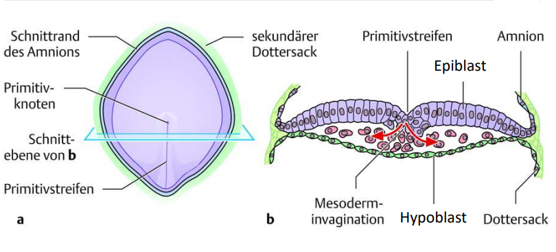 - 3tes Keimblatt: Mesoderm (Entstehung = Epiblasten wandern durch den Primitivstreifen zwischen zwischen Epiblast und Hypoblast)