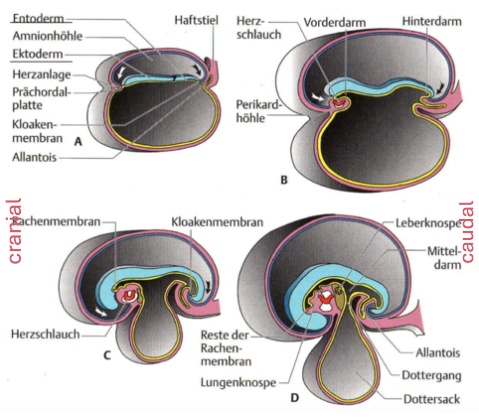 Darmrohr:Ähnlich schmiegt sich das Endoderm an, um das Darmrohr zu bilden. Ein Teil des Dottersacks wird so zum Mitteldarm, der anfangs noch über einen Verbindungsgang mit dem Dottersack verbunden ist.