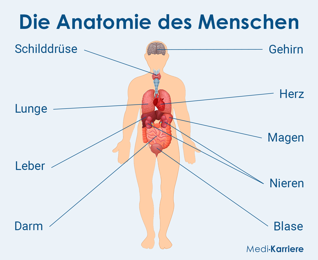 Die Anatomie beschäftigt sich mit dem Aufbau des Körpers. In der Anatomie wird der menschliche Körper in einen Körperstamm (mit Kopf, Hals und Rumpf) sowie die obere und untere Extremität unterteilt.