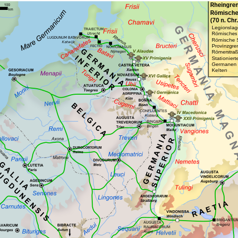 Die Römisch-Germanische Kriege, waren eine Reihe von Auseinandersetzungen zwischen dem Römischen Reich und germanischen Stämmen, die sich über einen Zeitraum von etwa 500 Jahren erstreckten und mit der Überschreitung des Rheins durch Julius Cäsar 55 v. Chr. begannen.