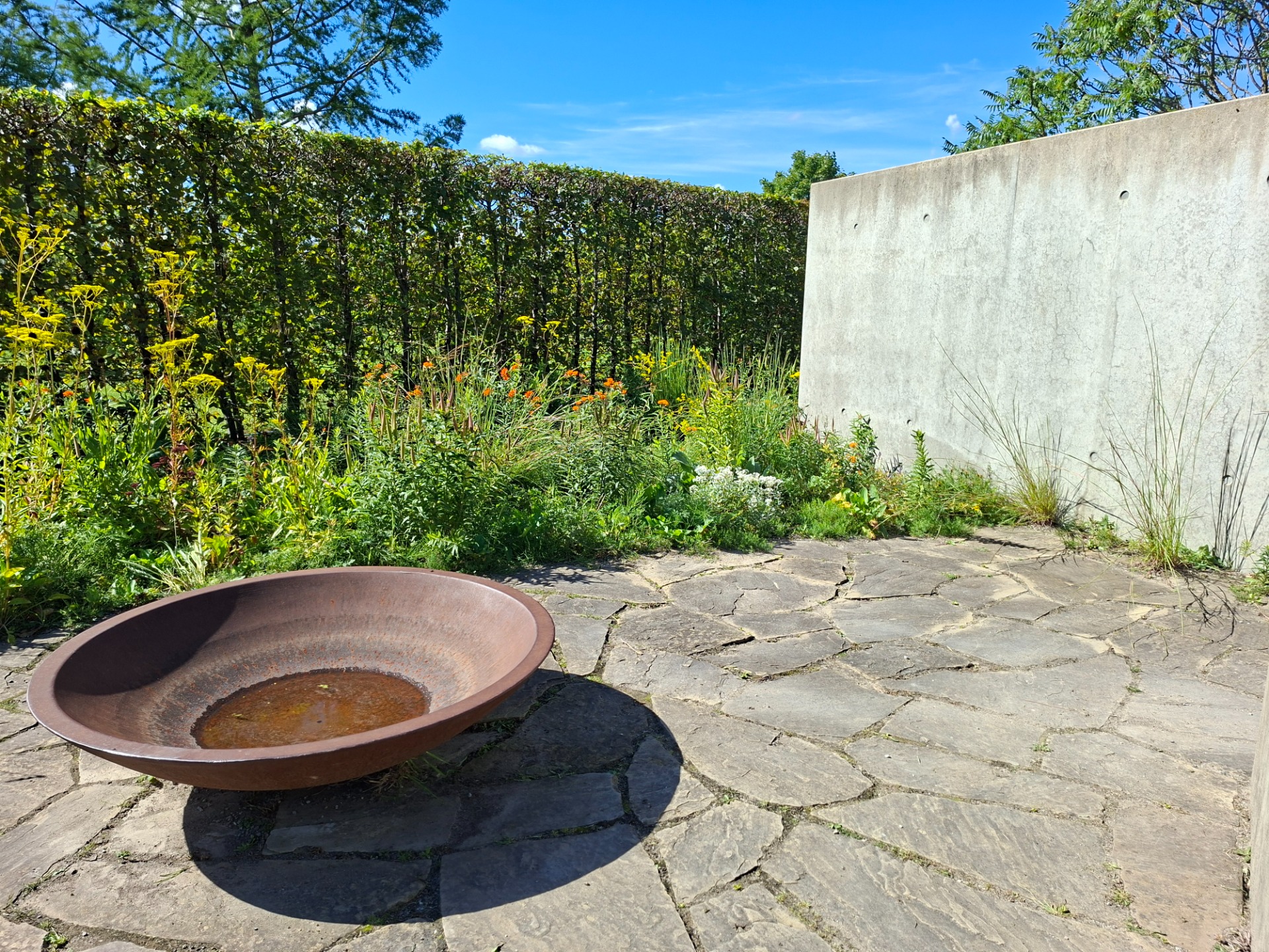 In dem von Tom Stuart-Smith gestalteten Gartenkabinett findest du eine Betonwand, die die früheren Behausungen des Menschen symbolisiert. Die ebenfalls aus Beton bestehende Bank steht sinnbildlich für eine Pritsche, und die Feuerschale gegenüber erinnert an den mythologischen Ursprung der Geschichte des Hauses. Der Bodenbelag ist ebenfalls so gestaltet, als hätte er ein früheres Haus überdauert. Er besteht aus Feinkies und Steinplatten.