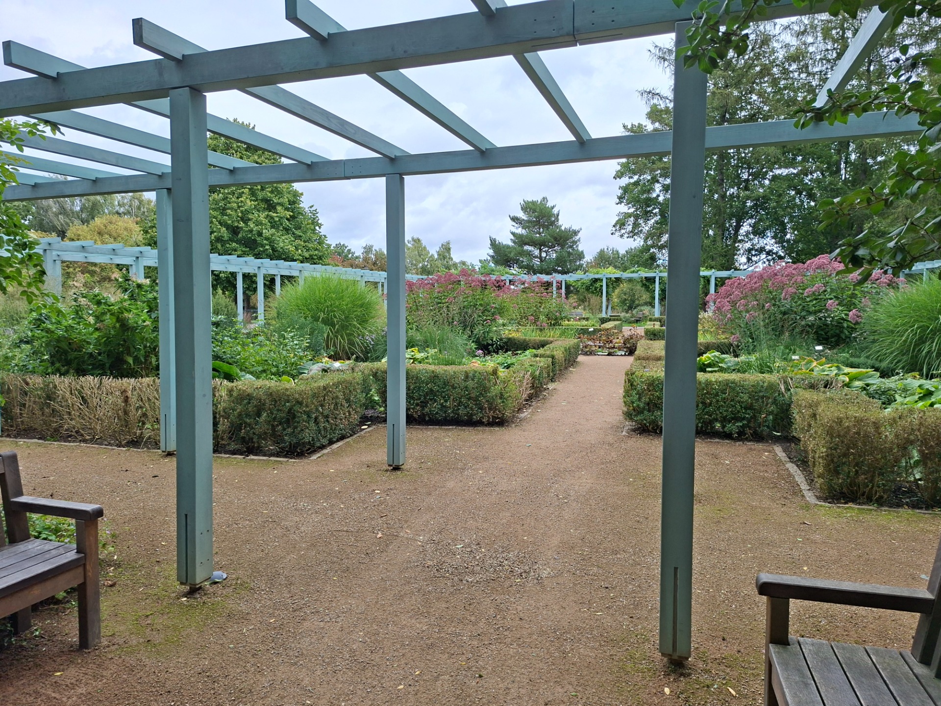 Im Zentrum des Gartens lädt dich eine türkisblaue Holzpergola zum Verweilen und zum Betrachten der Blütenoase ein.