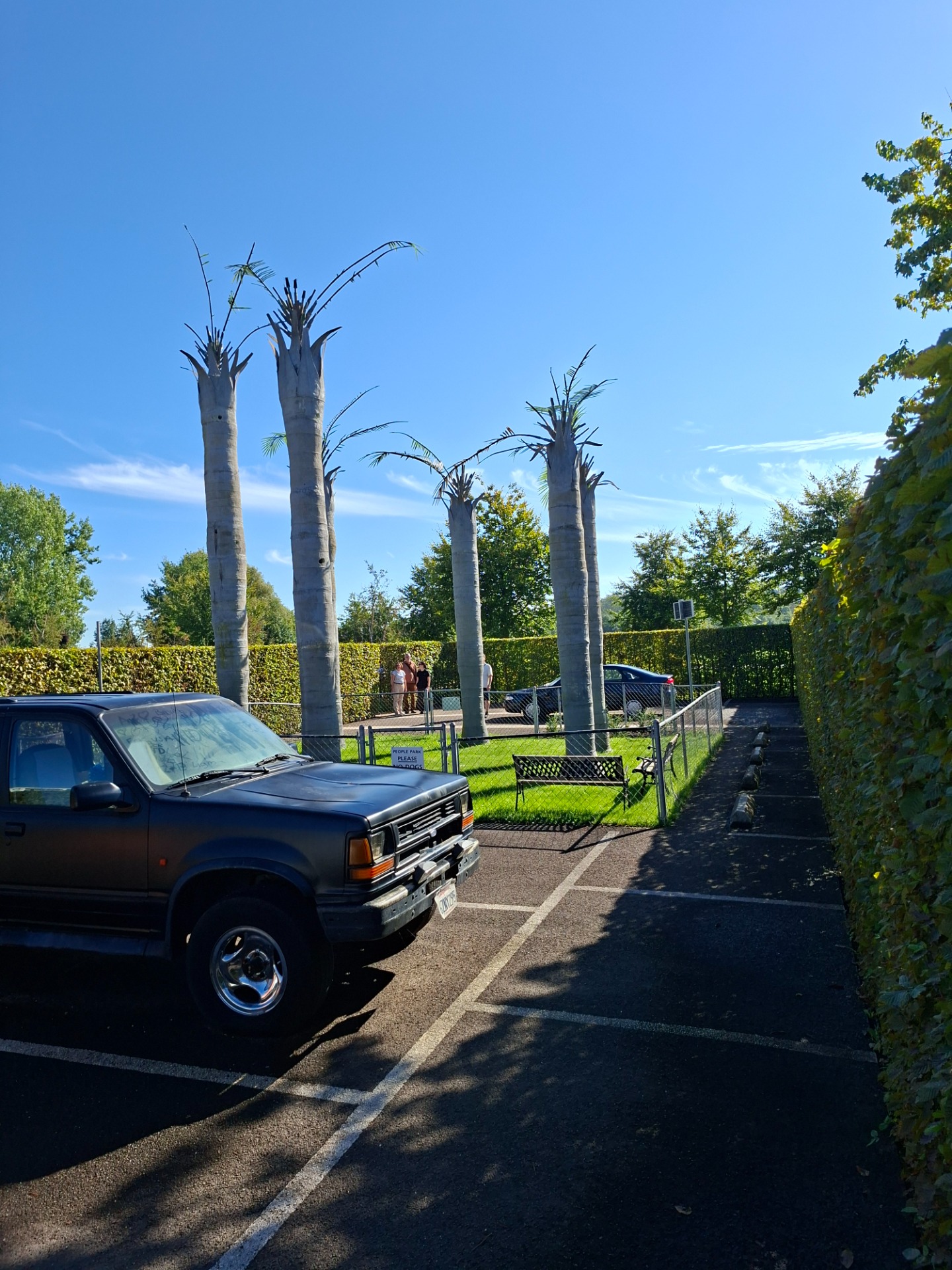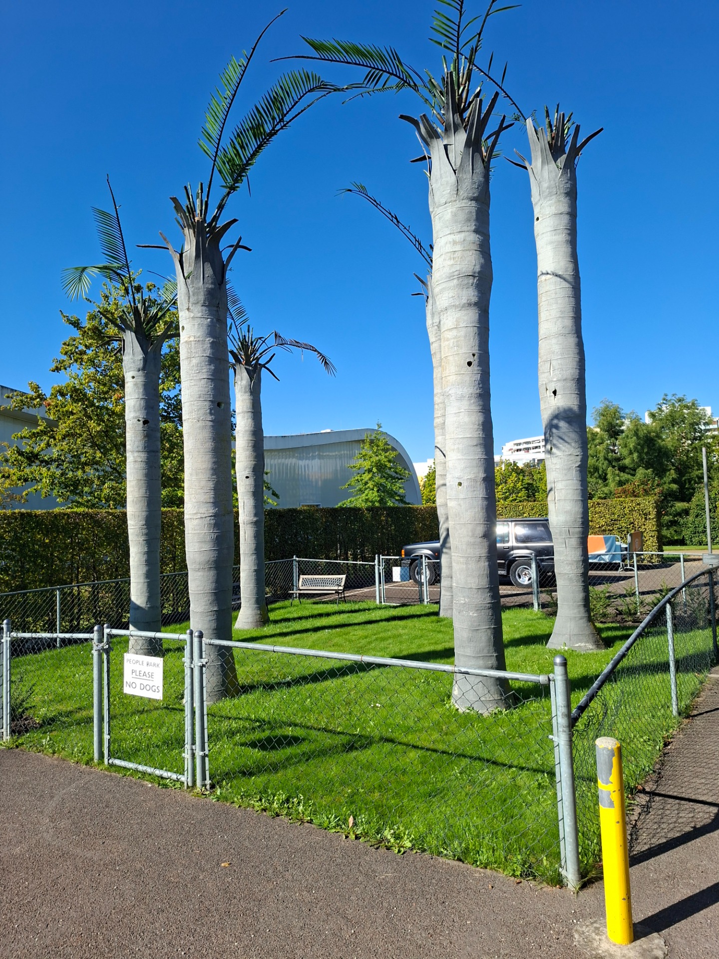 Hier ist man sich auf den ersten Blick nicht einmal sicher, ob es sich bei den sechs eingezäunten Palmen in der Mitte um echte Exemplare ihrer Art handelt. (Spoiler: Nein, tut es nicht.) Denn abgesehen von ein paar Mini-Raseninseln ist es hier mit der Natur nicht weit her .