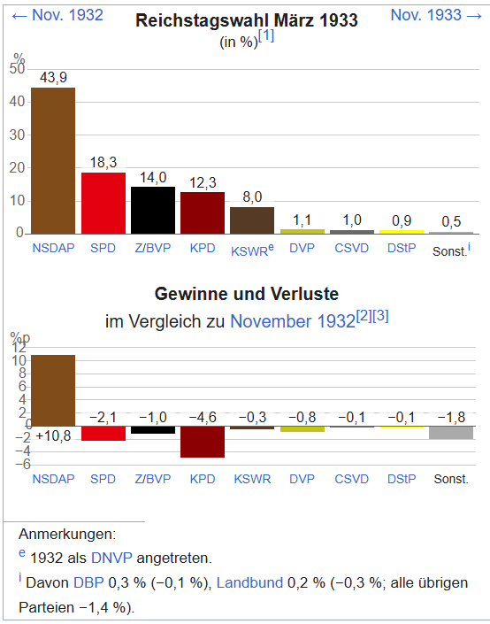 Bei der Wahl selbst konnte die NSDAP zwar stark zulegen, erhielt aber nicht die erhoffte absolute Mehrheit. Zusammen mit der Kampffront Schwarz-Weiß-Rot, einem von der DNVP dominierten Wahlbündnis, hatte die Regierung nach der Wahl eine parlamentarische Mehrheit und konnte darauf gestützt den Weg in die Diktatur ebnen.