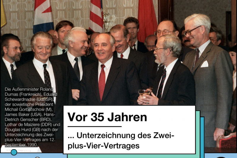 Mit dem Zwei-plus-Vier-Vertrag vom 12. September 1990 legten beide deutsche Staaten in Verhandlungen die Grundlage für die deutsche Wiedervereinigung, die am 3. Oktober 1990 zum Beitritt der DDR zur Bundesrepublik Deutschland führte.